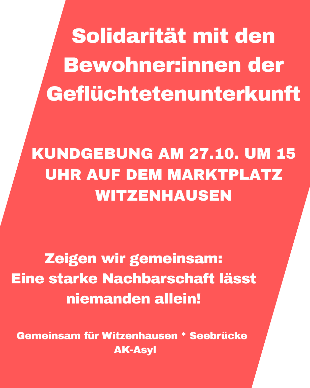 - Wir rufen alle Vermieter:innen auf, verfügbaren Wohnraum zur Vermietung anzubieten, damit die Betroffenen in Witzenhausen bleiben können.